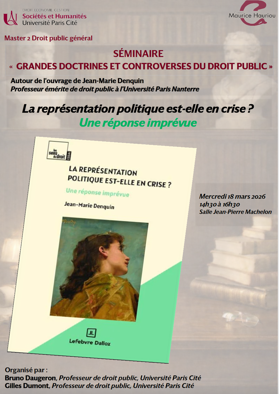 Séminaire consacré aux grandes doctrines et controverses du droit public sera organisé autour de l’ouvrage de Monsieur Jean-Marie Denquin, Professeur émérite de droit public à l’Université Paris Nanterre. Cette rencontre académique sera l’occasion d’examiner la question suivante : « La représentation politique est-elle en crise ? Une réponse imprévue ».