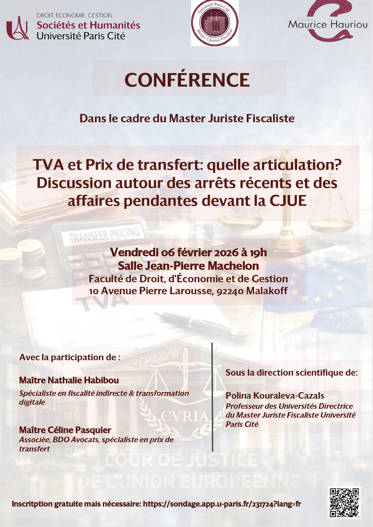 La Faculté de droit, d’économie et de gestion a le plaisir de vous convier au colloque organisé dans le cadre du Master Juriste fiscaliste, placé sous la direction scientifique du Professeur Polina Kouraleva-Cazals, intitulé : « TVA et Prix de transfert: quelle articulation? Discussion autour des arrêts récents et des affaires pendantes devant la CJUE ».