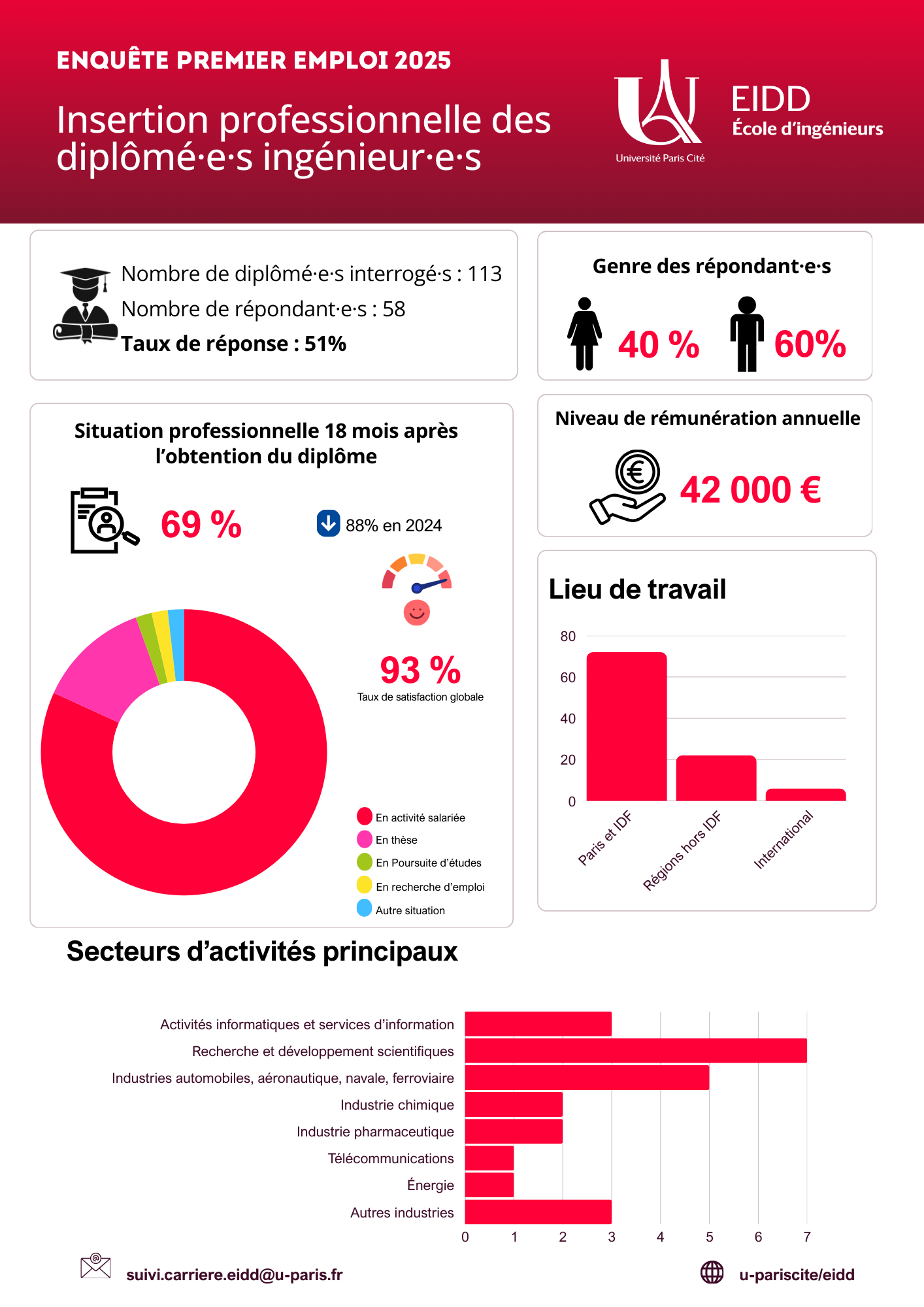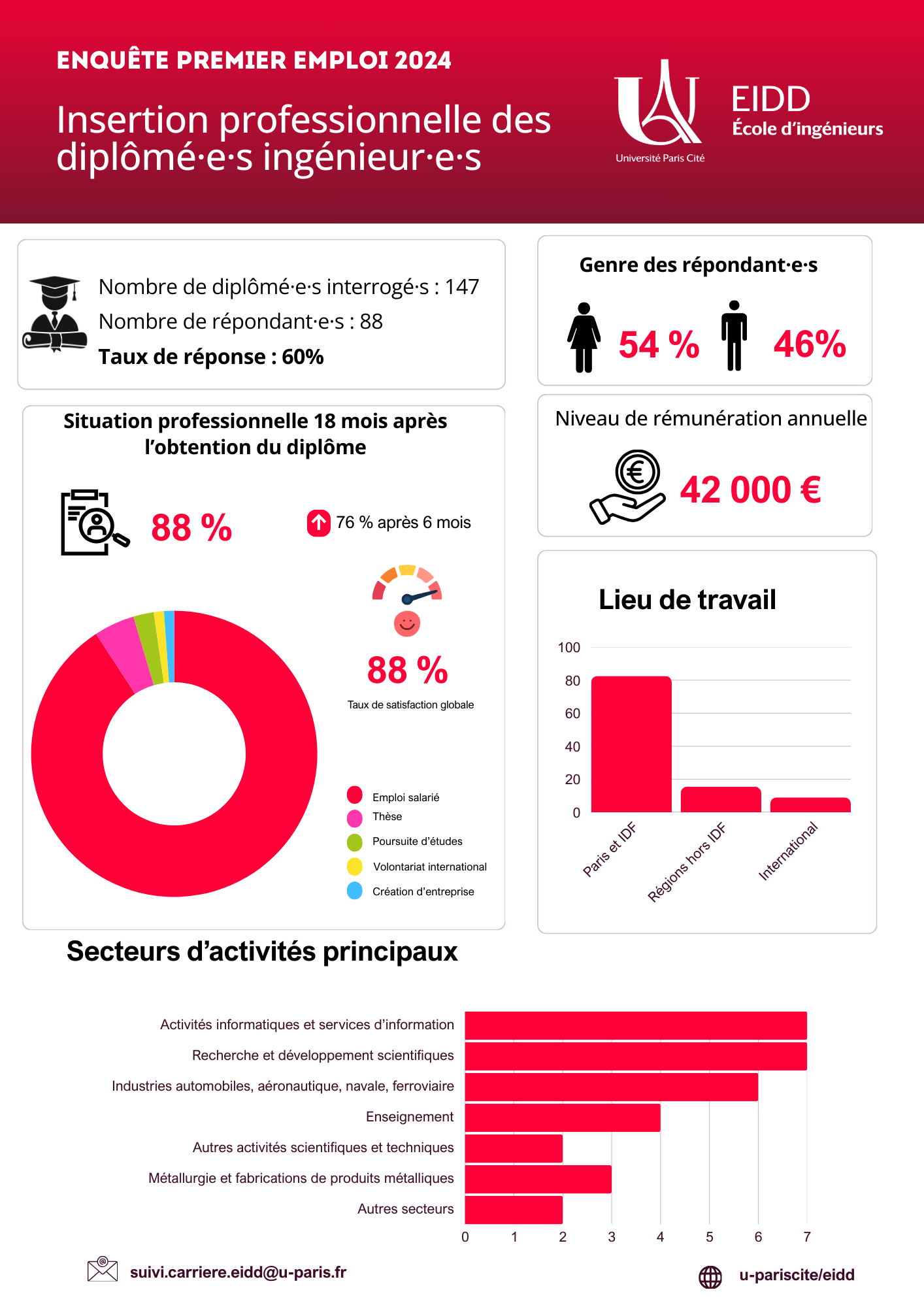 L’EIDD, école d’ingénieurs de l’Université Paris Cité consulte en année « n » les diplômé·e·s de la promotion n-1, n-2 sur leur devenir après l’obtention de leur titre d’ingénieur.