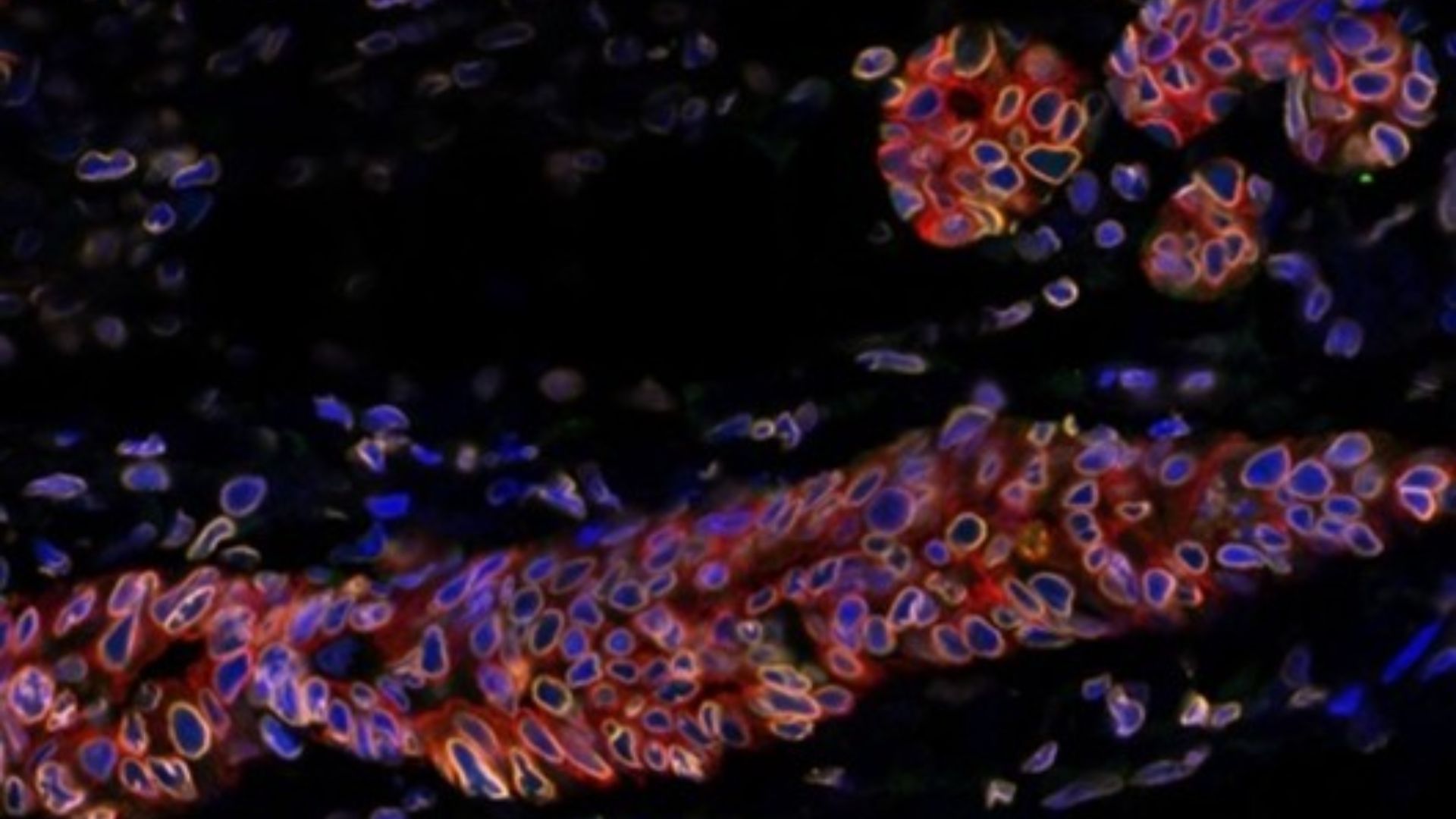 Tumeur du sein chez l’animal. Les cellules sont marquées en bleu et les molécules keratin 8 en orange.