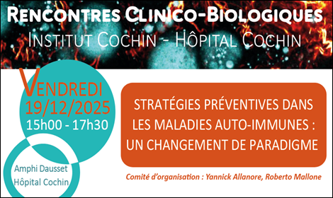 La rencontre Clinio-biologique de l’Institut Cochin – Hôpital Cochin consacrée aux Stratégies préventives dans les maladies auto-immunes : un changement de paradigme aura lieu le vendredi 19 décembre 2025 de 15h à 17h, en amphi Dausset de l’Hôpital Cochin