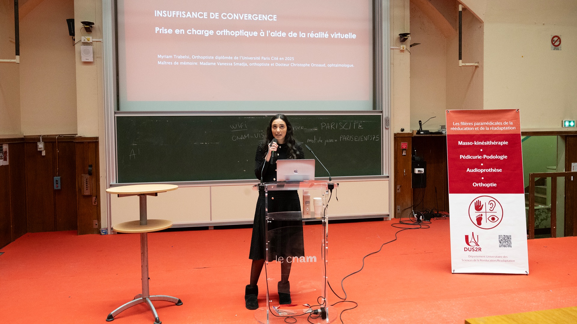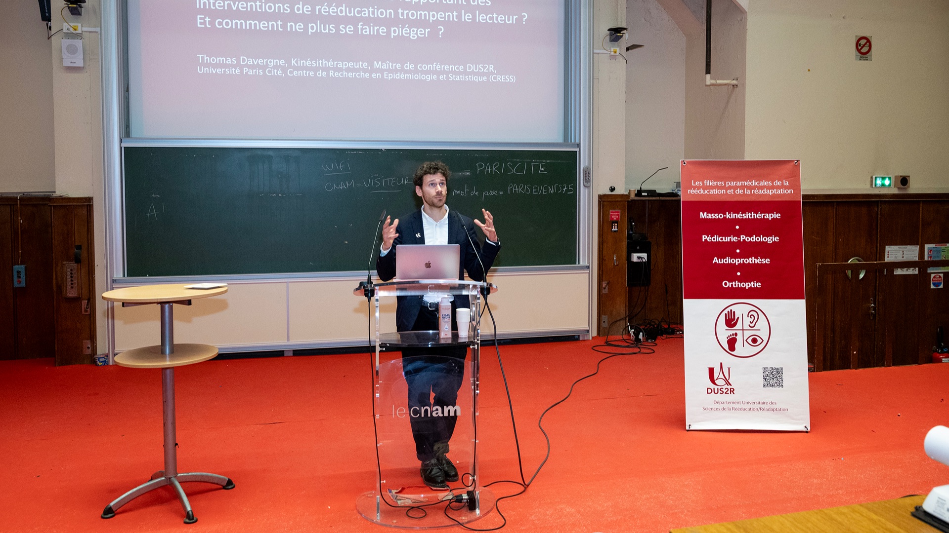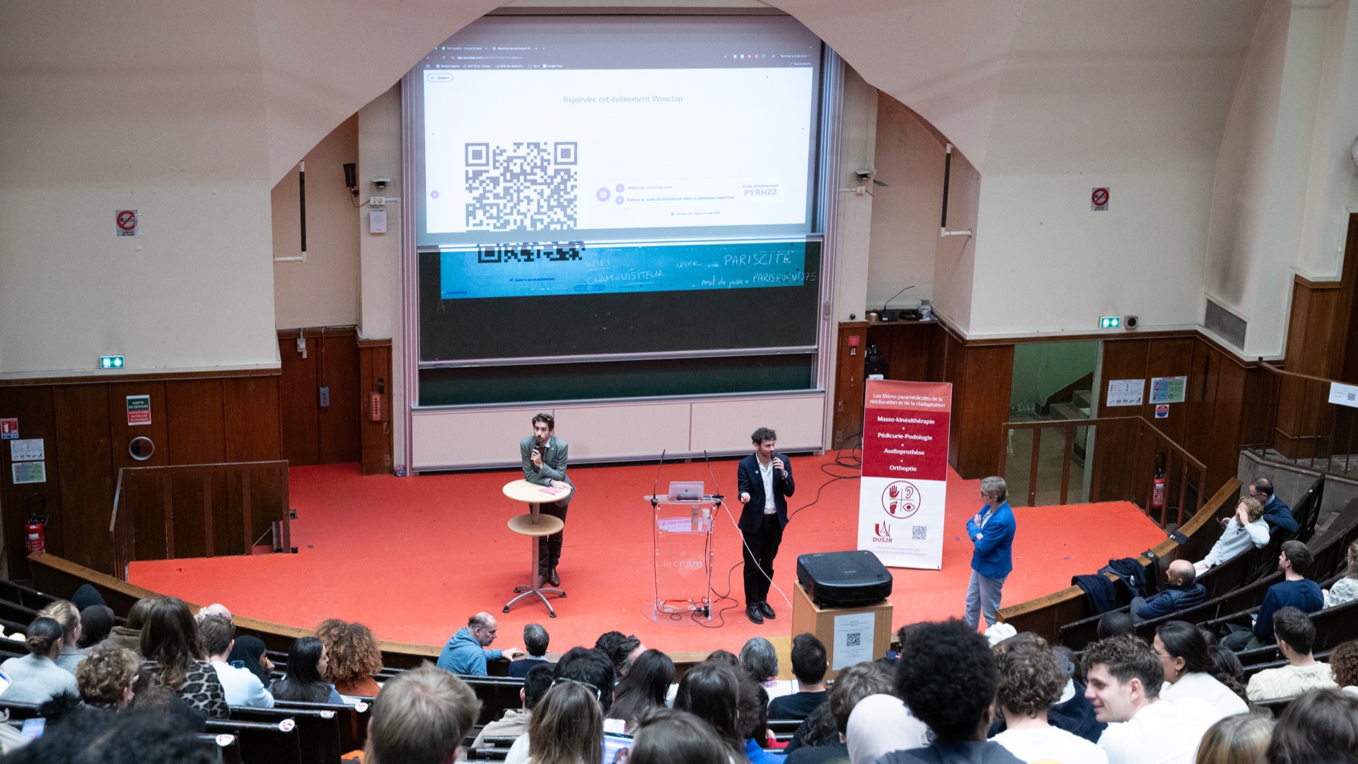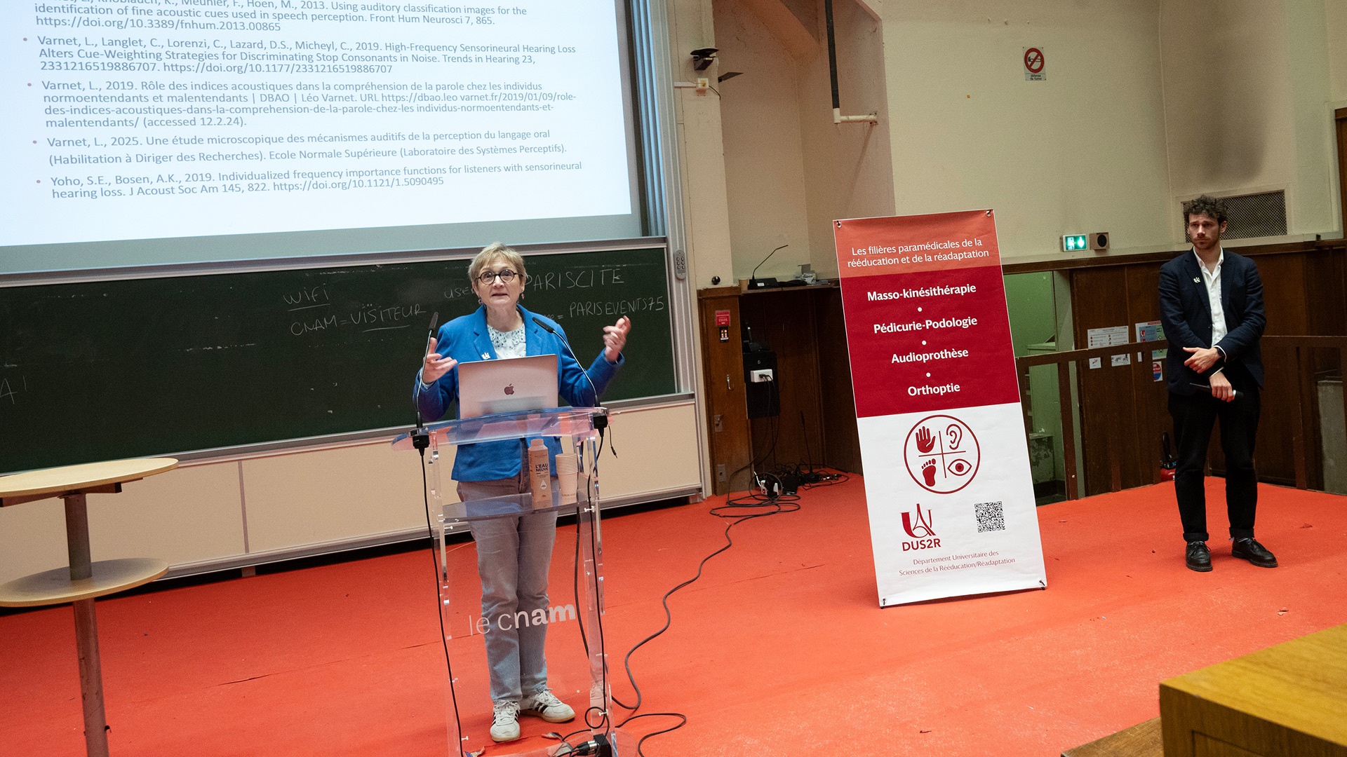 Le Département Universitaire de Sciences de la Rééducation et de la Réadaptation (DUS2R) de la Faculté de Santé a organisé, le mardi 18 novembre 2025 dans les locaux du CNAM, son troisième séminaire scientifique. Celui-ci a été riche en échanges et en valorisation des travaux étudiants et enseignants- chercheurs confirmés. L’événement a réuni la communauté pédagogique et scientifique autour de grands champs de la recherche intéressant spécifiquement les 4 formations du DUS2R  : masso-kinésithérapie, pédicurie-podologie, orthoptie et audioprothèse.