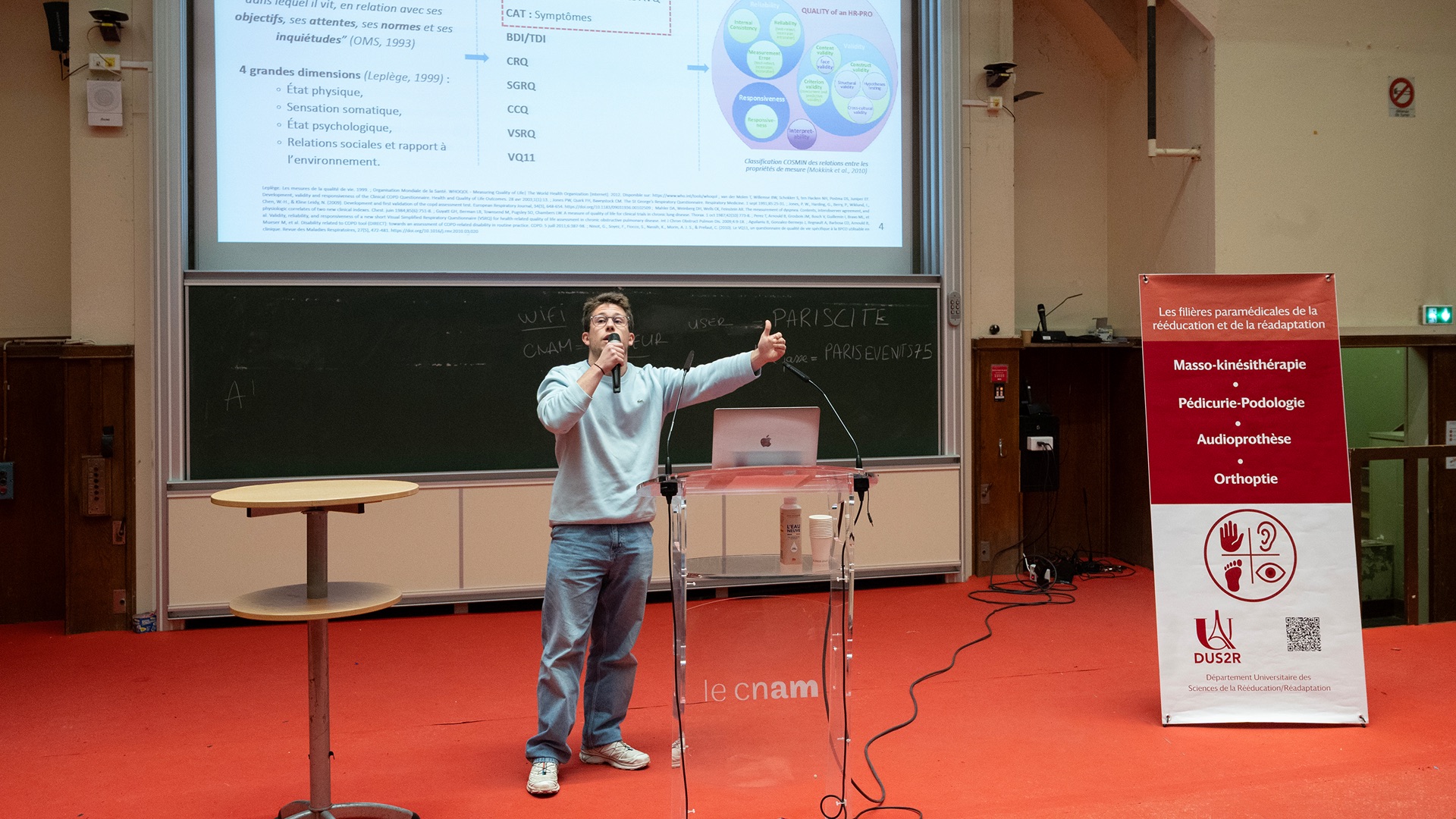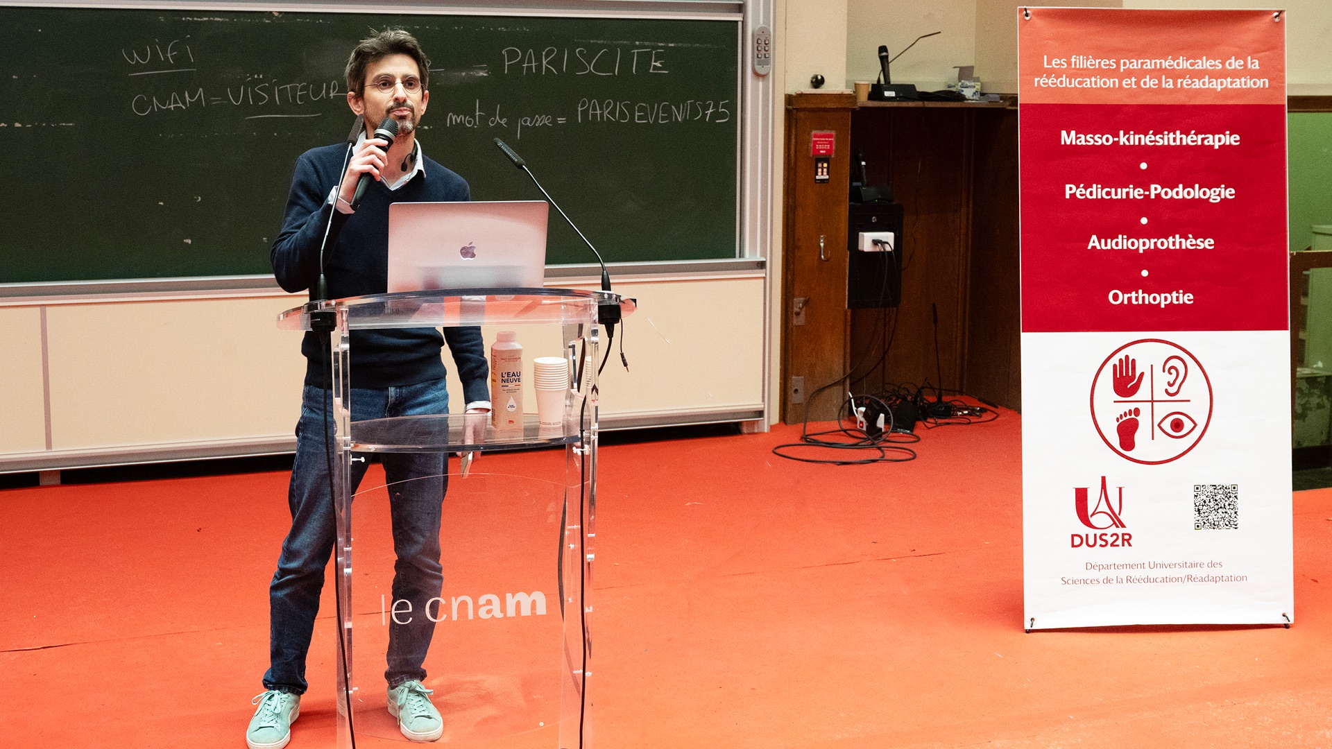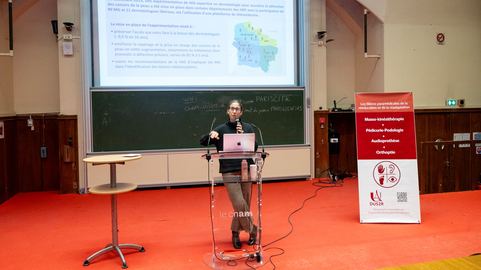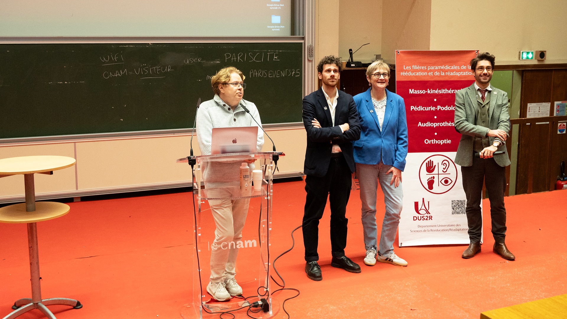 Le Département Universitaire de Sciences de la Rééducation et de la Réadaptation (DUS2R) de la Faculté de Santé a organisé, le mardi 18 novembre 2025 dans les locaux du CNAM, son troisième séminaire scientifique. Celui-ci a été riche en échanges et en valorisation des travaux étudiants et enseignants- chercheurs confirmés. L’événement a réuni la communauté pédagogique et scientifique autour de grands champs de la recherche intéressant spécifiquement les 4 formations du DUS2R  : masso-kinésithérapie, pédicurie-podologie, orthoptie et audioprothèse.