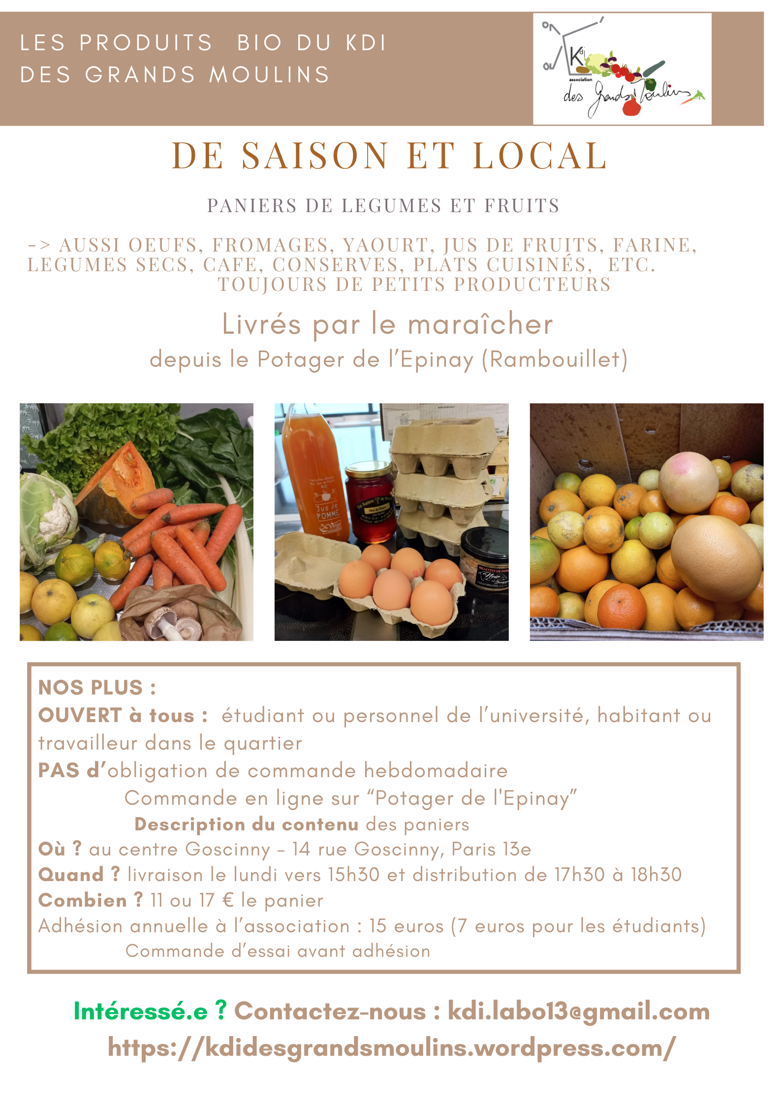 C’est la rentrée, vous êtes en pleine forme et pourquoi pas une alimentation saine à portée de main ? L’association « KDI des Grands Moulins » organise sur le campus des Grands Moulins, des livraisons de légumes, fruits et autres produits issus de l’agriculture biologique à des prix plus que raisonnables.