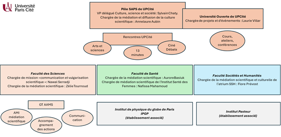 1. Un groupe de travail dédié. Personnels (chercheurs, enseignants-chercheurs et personnels techniques/administratifs) et étudiants de la Faculté des Sciences composent le groupe de travail “accompagnement des actions de médiation scientifique” (GT AAMS). Quatorze personnes composent ce groupe dont une chargée de mission sur “la communication et la vulgarisation scientifique”, une chargée de médiation scientifique, la directrice du pôle Recherche facultaire, deux représentantes du pôle Culture universitaire dont sa responsable, une représentante de la direction générale des bibliothèques et des musées de UPCité (DGDBM), la vice-doyenne étudiante, la vice-doyenne de la Vie des Campus et de la Vie Étudiante, plusieurs enseignants chercheurs ou personnels administratifs en charge de projets de médiation innovants (CBioNum, escape game, web radio) et voire même responsable de formation en médiation scientifique (master “audiovisuel et communication scientifiques”) et la chargée de communication facultaire. La pluralité des profils présents dans le GT AAMS permet une complémentarité précieuse des compétences dans cette discipline. Très opérationnel, le GT AAMS a pour mission d’accompagner les porteurs de la Faculté dans la conception et la mise en œuvre de ce type de projet de façon très concrète en leur apportant un soutien technique (selon le support, type de dispositif envisagé) et un accompagnement dans le développement de partenariat, la recherche de prestataires, le lien avec le public visé, le soutien à la coordination, la mise en relation avec des initiatives existantes. Ce groupe de travail permet également d’échanger pratiques et contacts.