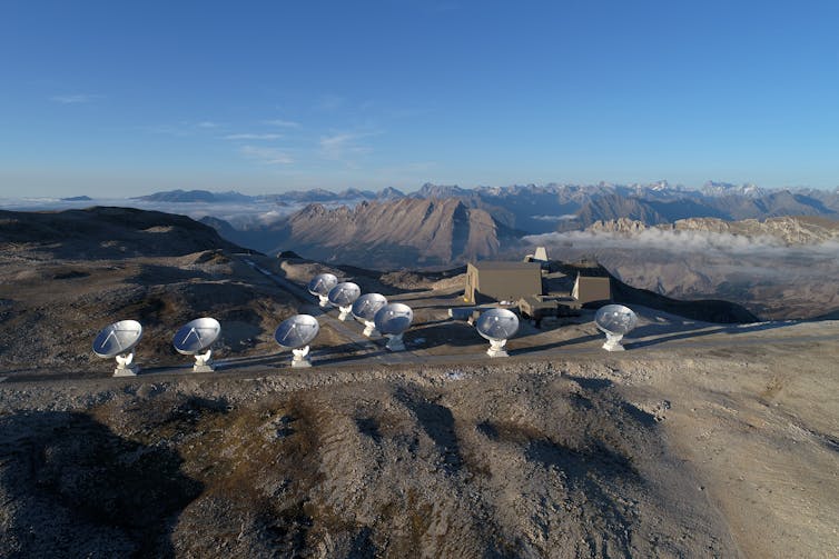 Photo aérienne de l’observatoire NOEMA sur le plateau de Bure montrant 9 (sur 12 lorsque le projet sera à son terme) antennes de 15 mètres.