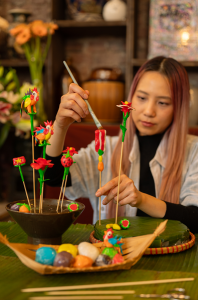 Le To Hé est l’art traditionnel de créer des figurines pleines de couleur en pâte de riz ! Poulets, poissons, dragons, fruits, fleurs, personnages connus… Ces petites figures perchées au sommet d’un pic en bambou sont des jouets traditionnels plébiscités par les enfants, même si l’art se perd doucement face aux jouets modernes. – en partenariat avec Hanoï 1988.